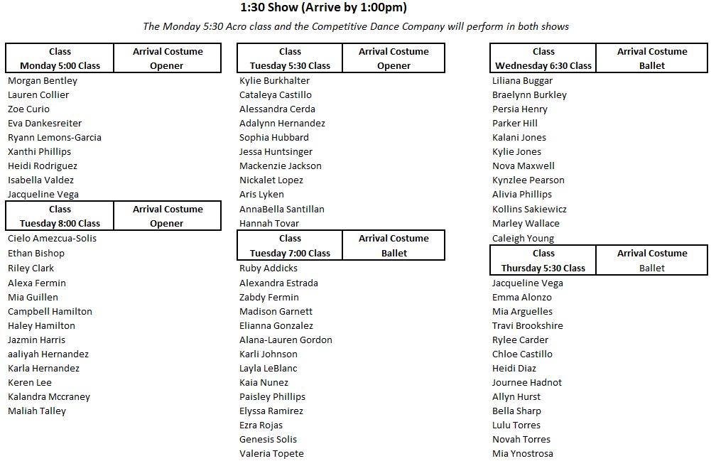 All dancers should arrive 30 minutes before their show time dressed in the costume listed next to their class on the show times table.